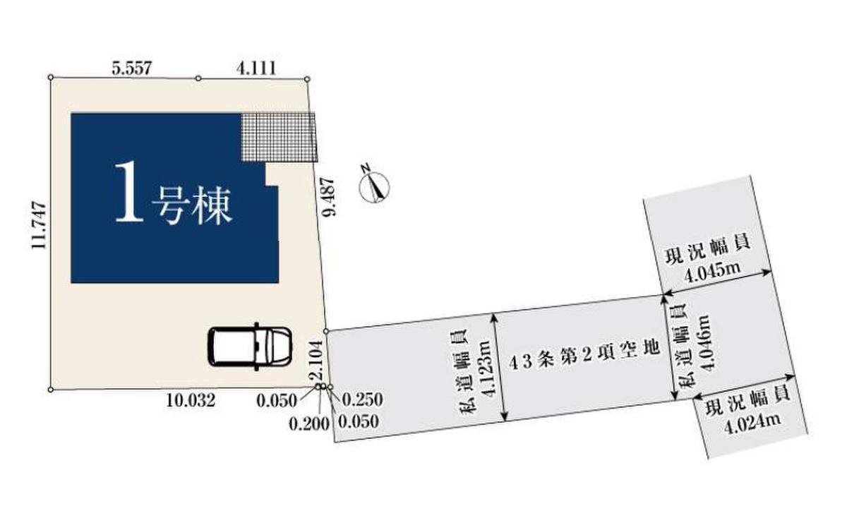| 駐車場 | 1台 | 道路の幅員 | 南東側約4m(私道43条但書)、私道持分なし(私道通行掘削承諾有り)/越境有り(覚書無し) |