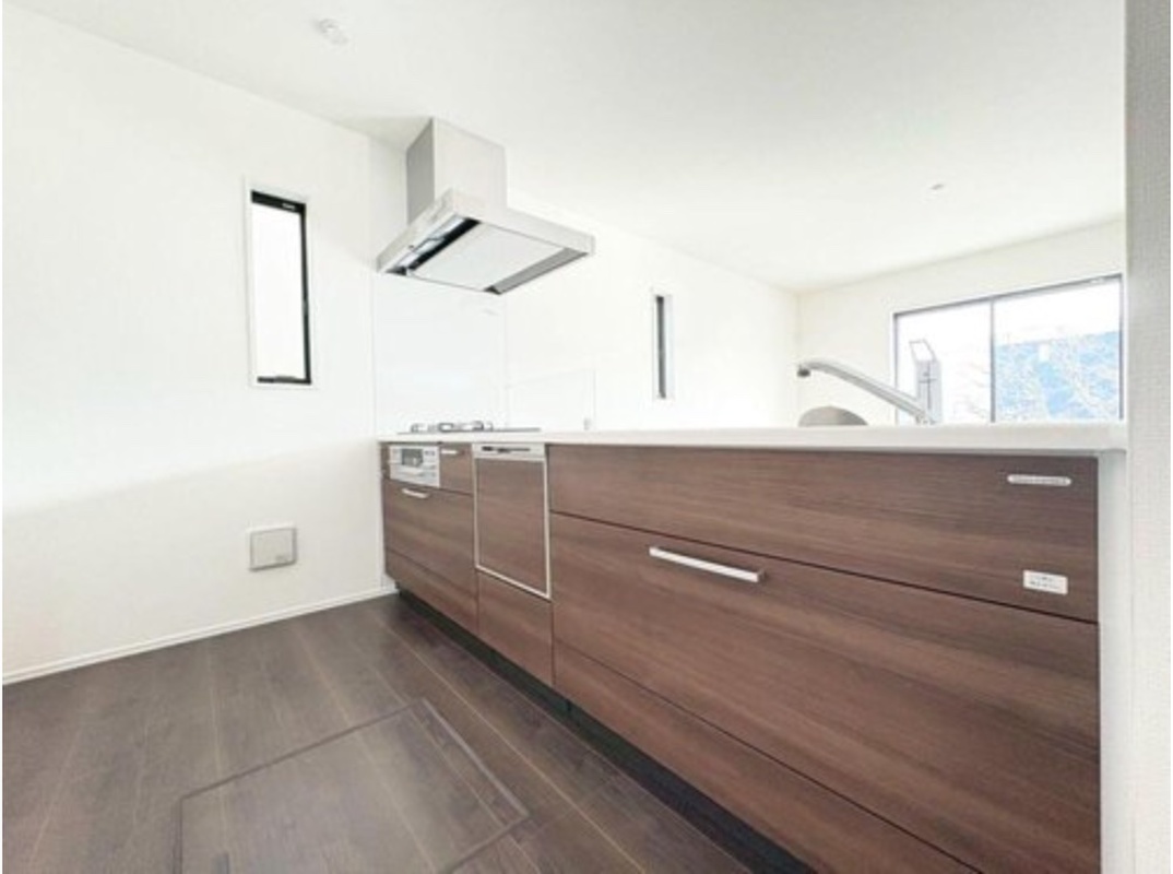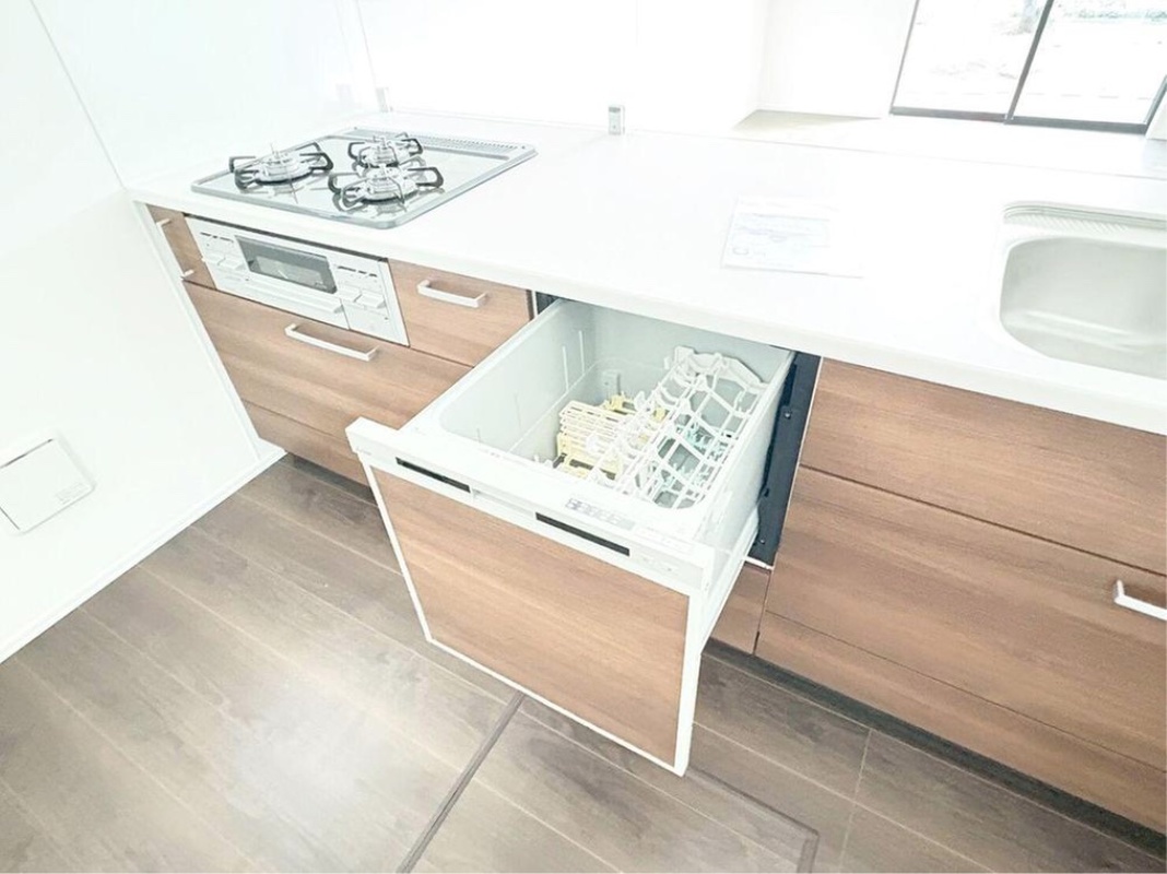 ビルトイン式食洗機を標準完備し、奥様の家事を時短致します。家族とのコミュニケーションを楽しめる対面キッチンの裏には大型の冷蔵庫やカップボードを配置しても充分な広さを確保。