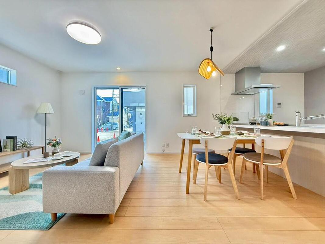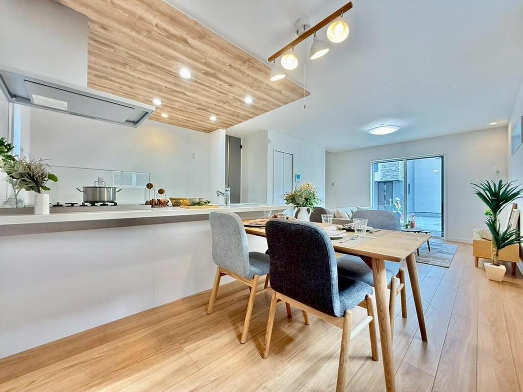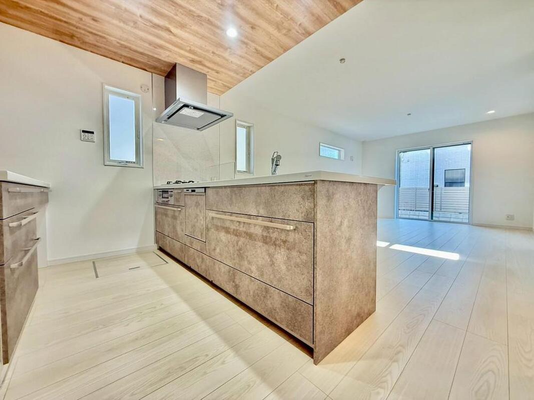明るい光が差し込む、機能的なカウンターキッチン。シンクとコンロが使いやすく配置され、家族の食卓を囲む準備もスムーズです。
