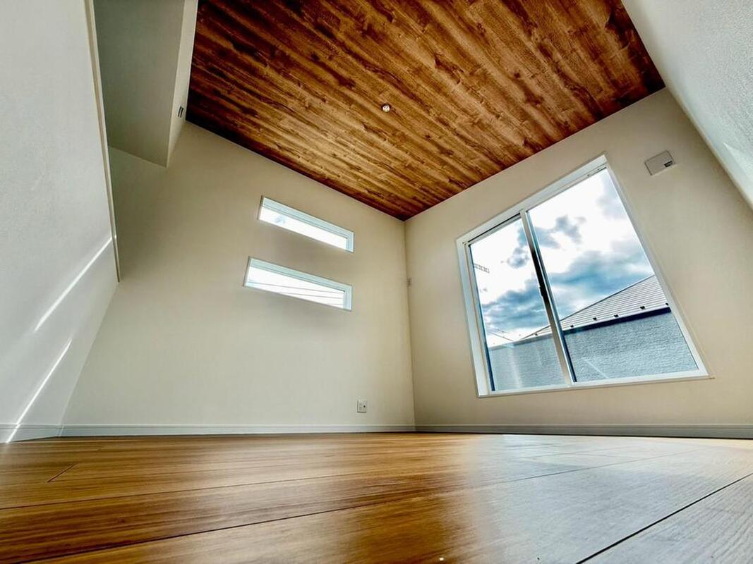 ・木の温もり溢れる勾配天井とフローリングが心地よい居室