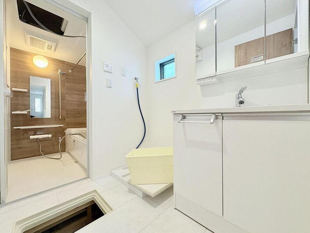 白を基調とした清潔感あふれる洗面所は、朝の忙しい時間も家族みんなで気持ち良く使えます。洗濯機置き場も近く、家事動線もスムーズで時短を実現します。