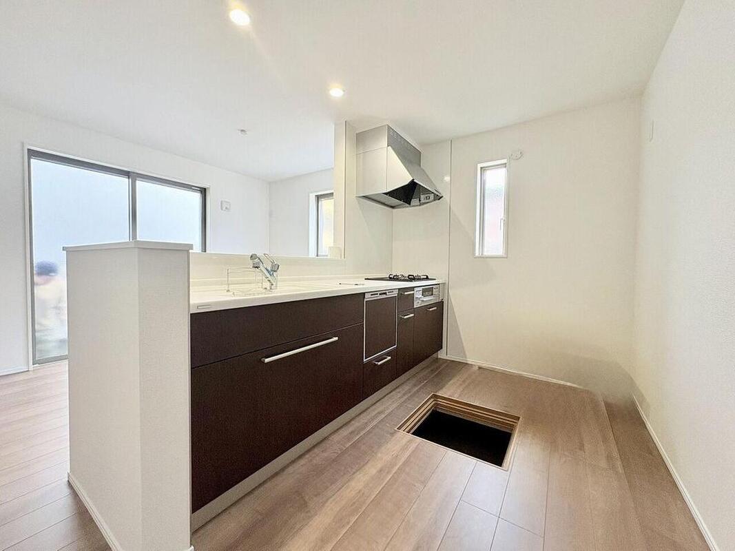 家族の会話が弾む対面キッチンで、毎日の食卓がより豊かに。広々とした調理スペースと豊富な収納で家事効率もアップ。床下収納も完備し、すっきり片付く空間です。