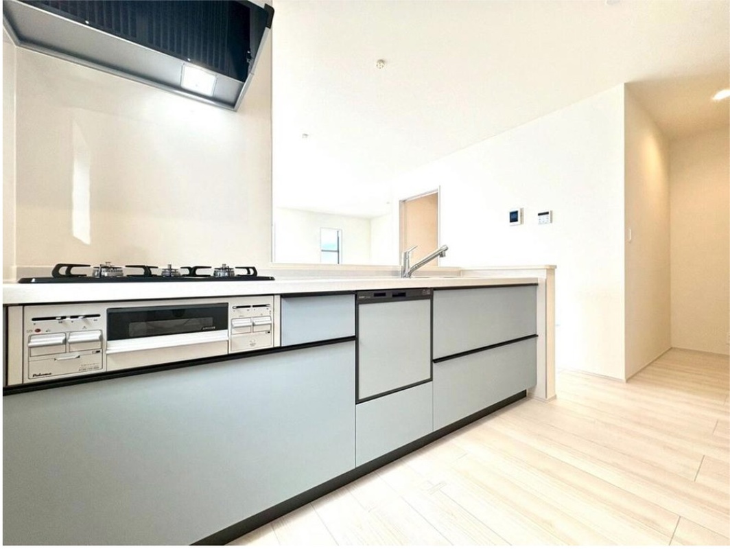 ビルトイン式食洗機を標準完備し、奥様の家事を時短致します。家族とのコミュニケーションを楽しめる対面キッチンの裏には大型の冷蔵庫やカップボードを配置しても充分な広さを確保。