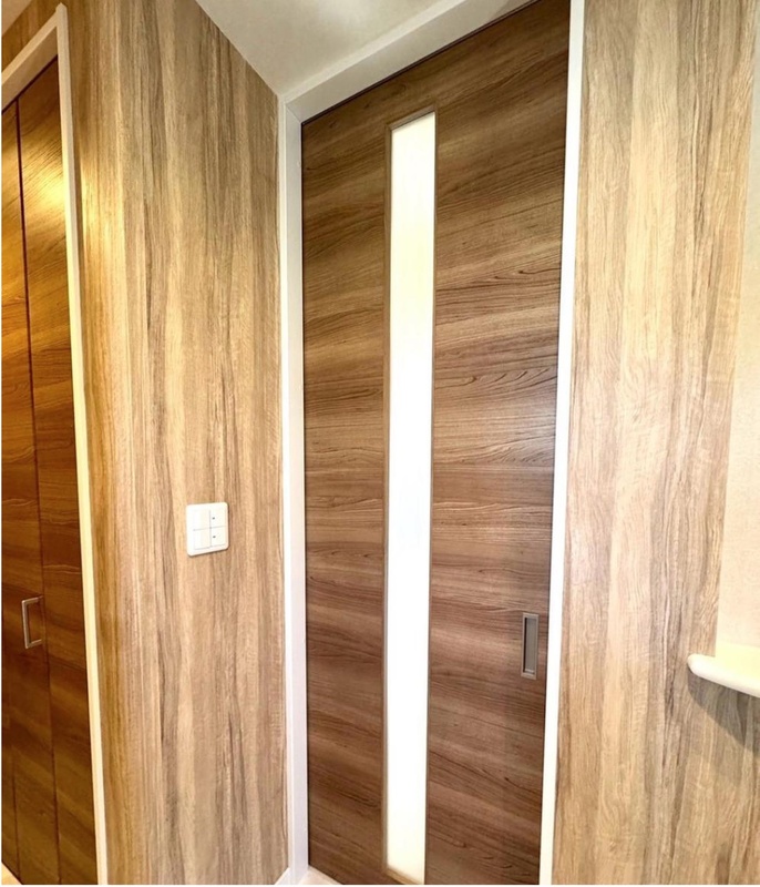 木目調の引き戸と縦長の採光窓が印象的な玄関。明るく開放的な空間...
