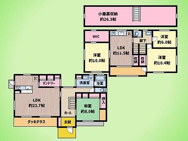 ○リビング広々22.7帖、小屋裏収納26.3帖