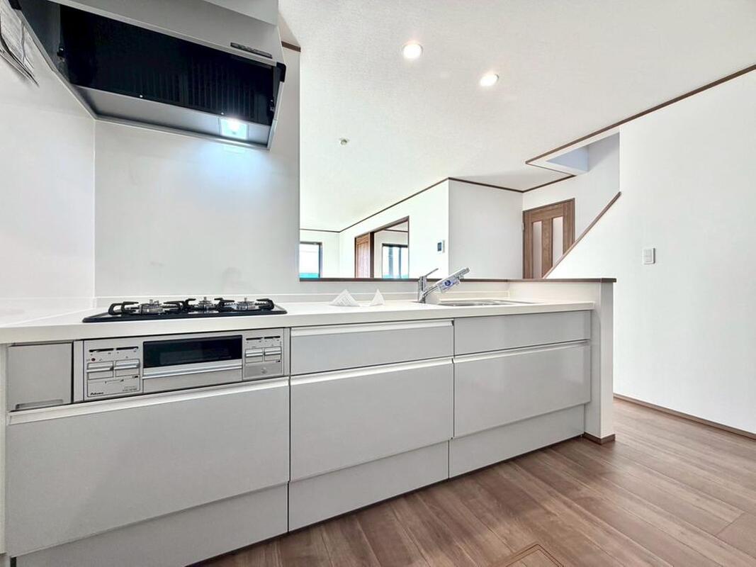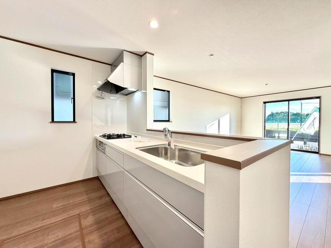 リビング・ダイニングを見渡せる対面式キッチンは、料理をしながら家族との会話も楽しめる設計。お子さまの様子を見守りながら調理ができるので、子育て世代にもぴったりです。