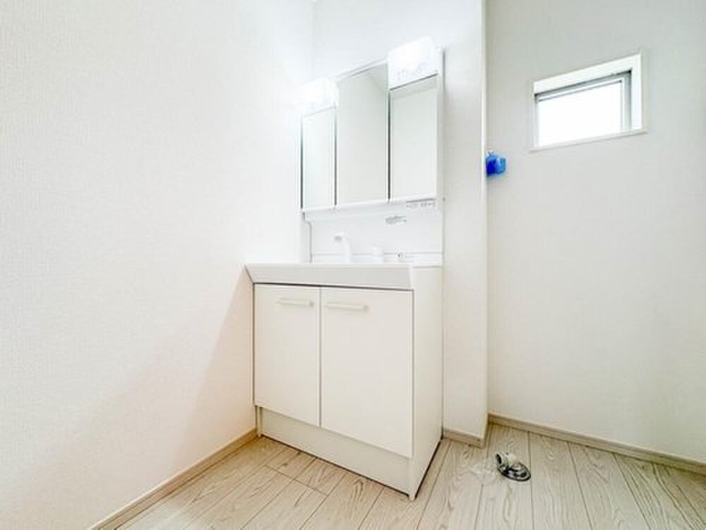 ミラーを手前に引けば、楽な姿勢で髭剃りやメイクができます。合わせ鏡にすればヘアスタイルのチェックもラクラク。洗面化粧台のミラー裏にはたっぷり入る収納スペースを設けています。