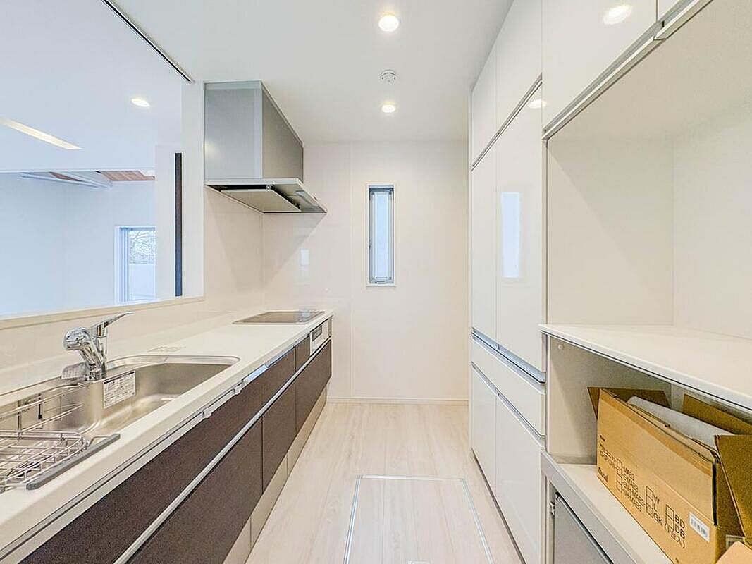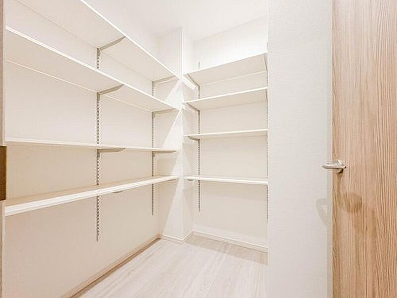 キッチン横にはパントリーを完備。ついつい買いすぎてしまった日用品や食料品のストックはもちろん、いざという時のための非常食や防災グッズなどの収納にお役立てください。