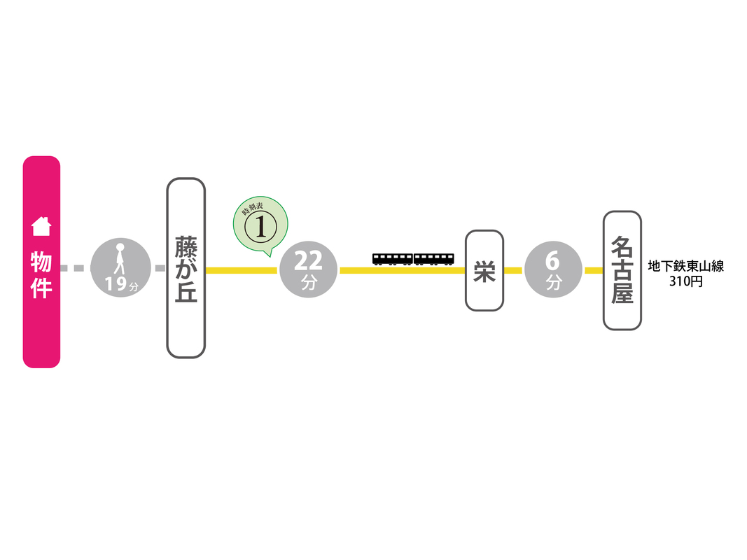 名古屋市営東山線「藤が丘」駅 徒歩19分 愛知高速東部丘陵線「はなみずき通」駅 徒歩23分 名古屋市営東山線「本郷」駅 徒歩33分 |