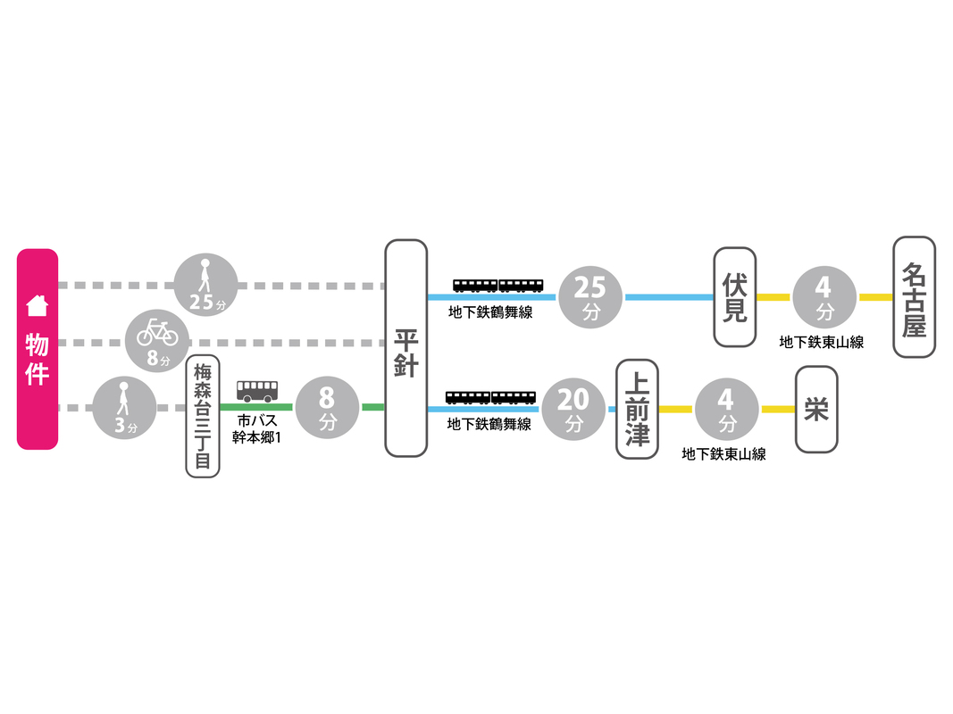 名古屋市営鶴舞線「平針」駅 徒歩25分 名古屋市営鶴舞線「赤池」駅 徒歩30分 名古屋市営鶴舞線「原」駅 徒歩37分 |