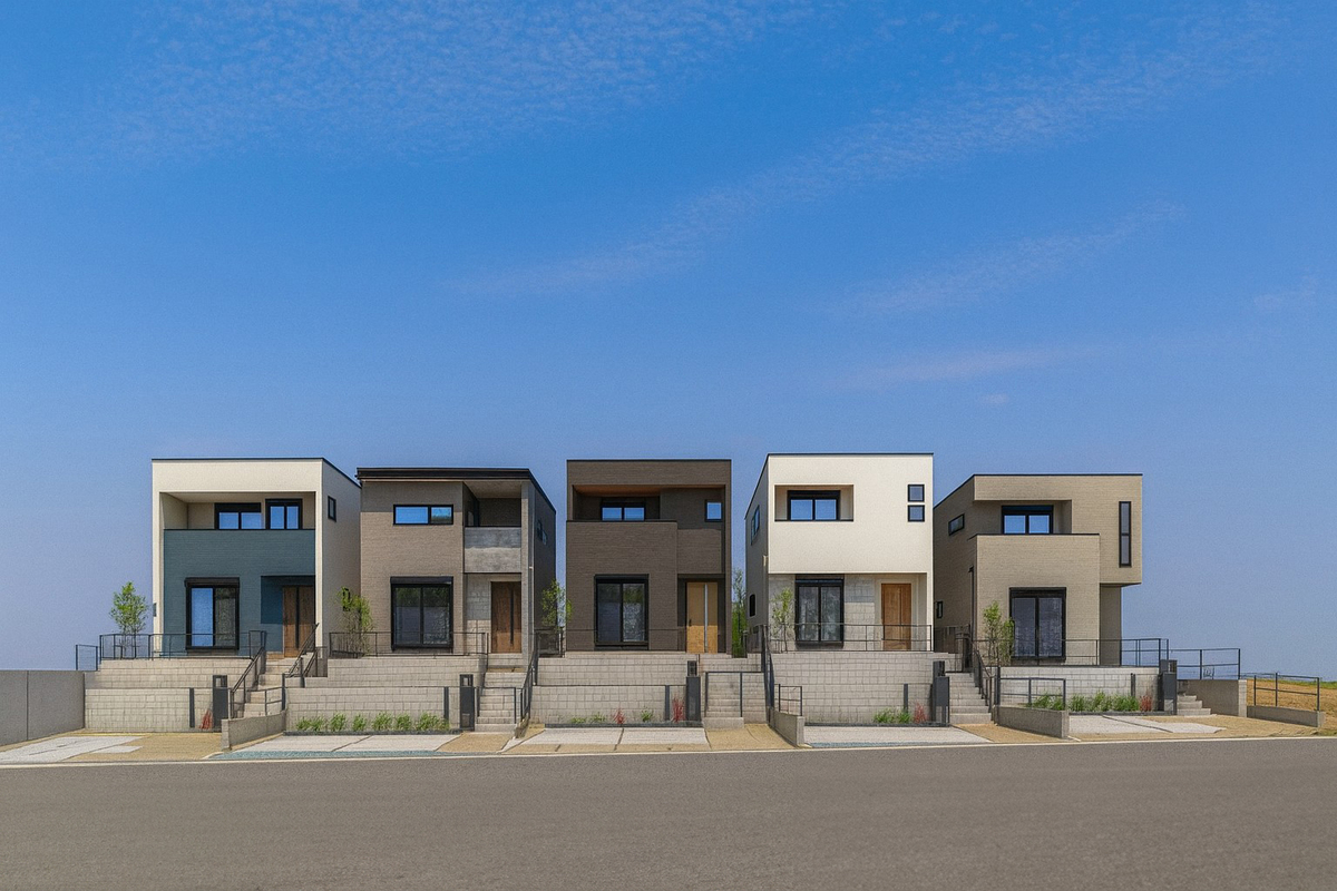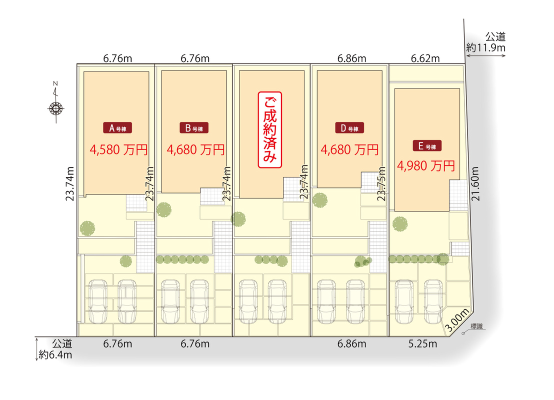 | 建物面積 | 103.94m2(E号棟)~109.74m2(B号棟) | 土地面積 | 160.50m2(A号棟)~164.40m2(E号棟) |