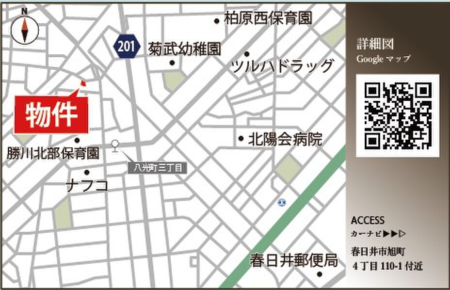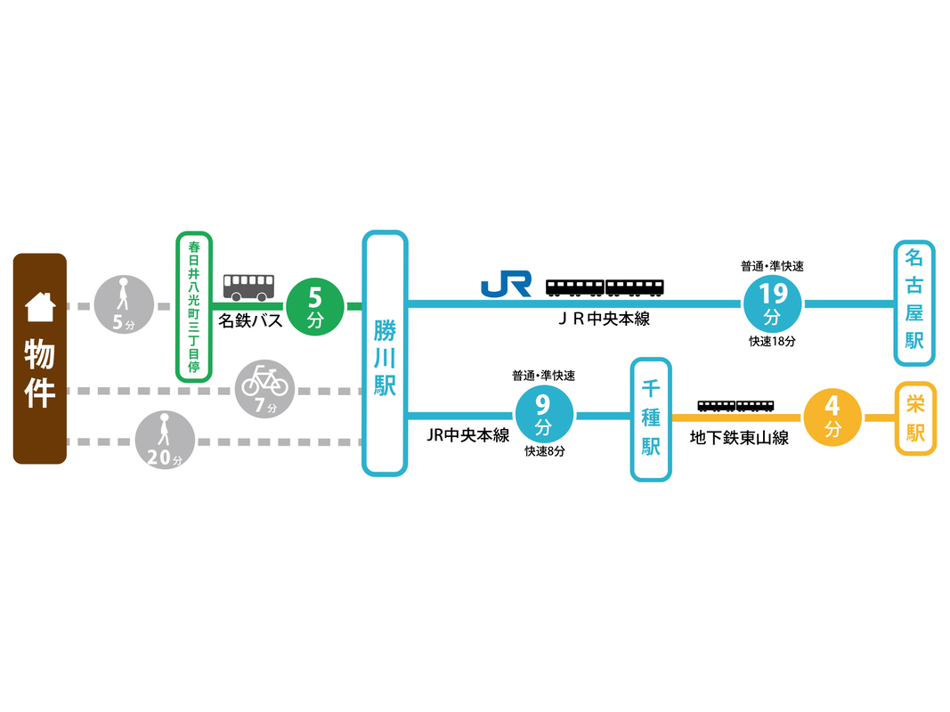 JR中央本線「勝川」駅 徒歩20分 JR中央本線「勝川」駅 名鉄バス5分「八光町三丁目」停 徒歩5分 名鉄小牧線「味美」駅 徒歩24分 |