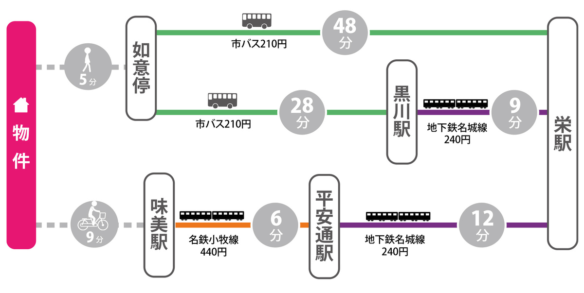 バス 徒歩5分 JR東海交通城北線「味美」駅 徒歩23分 自転車8分 名鉄小牧線「味美」駅 徒歩26分 自転車9分 |