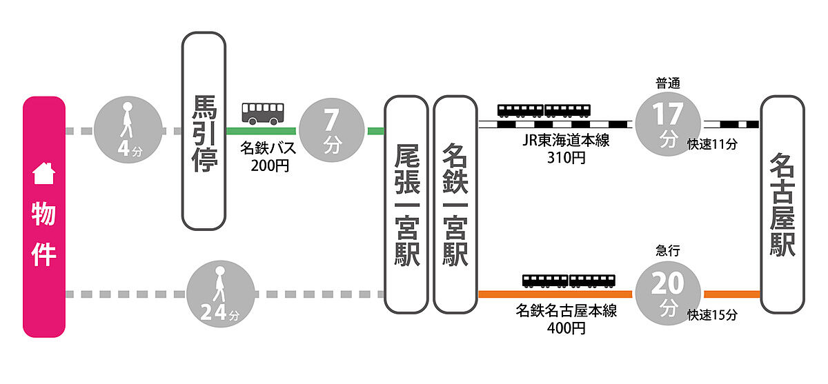 名鉄名古屋本線「名鉄一宮」駅 徒歩24分 名鉄尾西線「西一宮」駅 徒歩22分 名鉄バス「馬引」 徒歩4分 |
