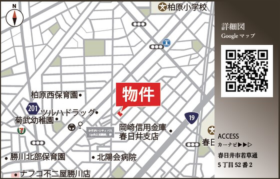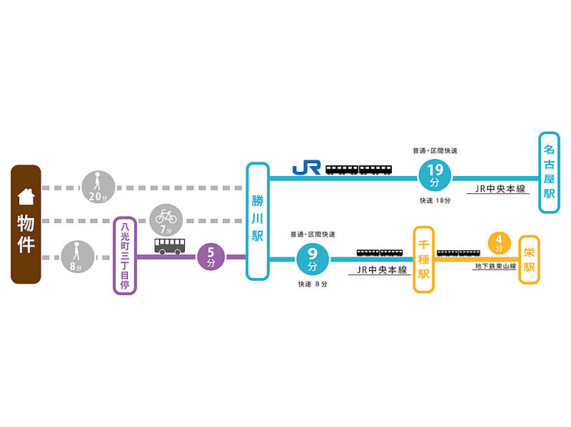 JR中央本線「勝川」駅 徒歩20分 JR中央本線「勝川」駅 名鉄バス5分「八光町三丁目」停 徒歩8分 名鉄小牧線「味美」駅 徒歩33分 |