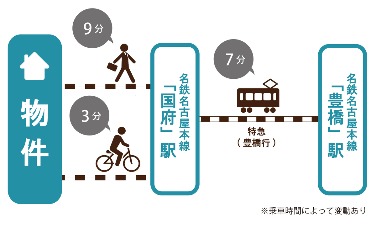 名鉄名古屋本線「国府」駅 徒歩9分 名鉄名古屋本線「御油」駅 徒歩20分 名鉄豊川線「八幡」駅 徒歩27分 |