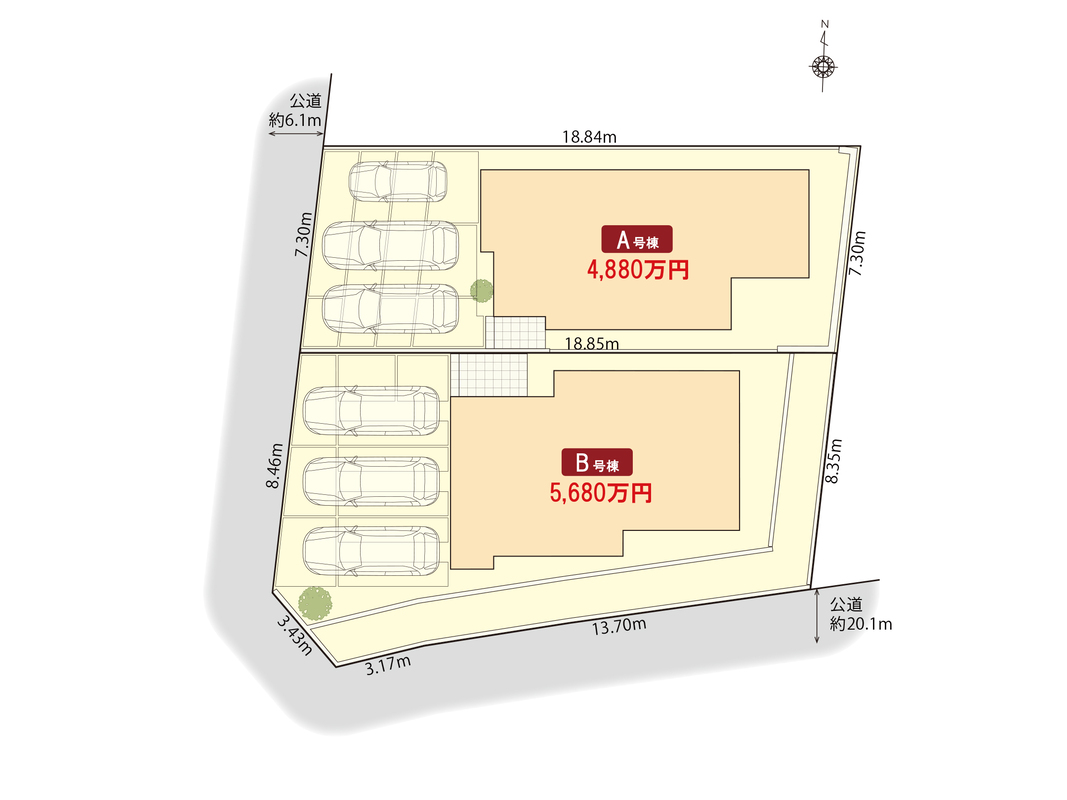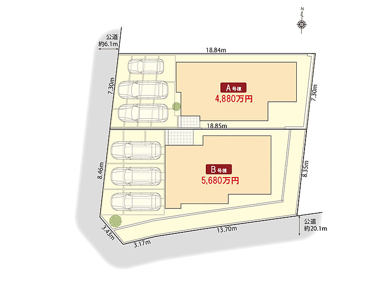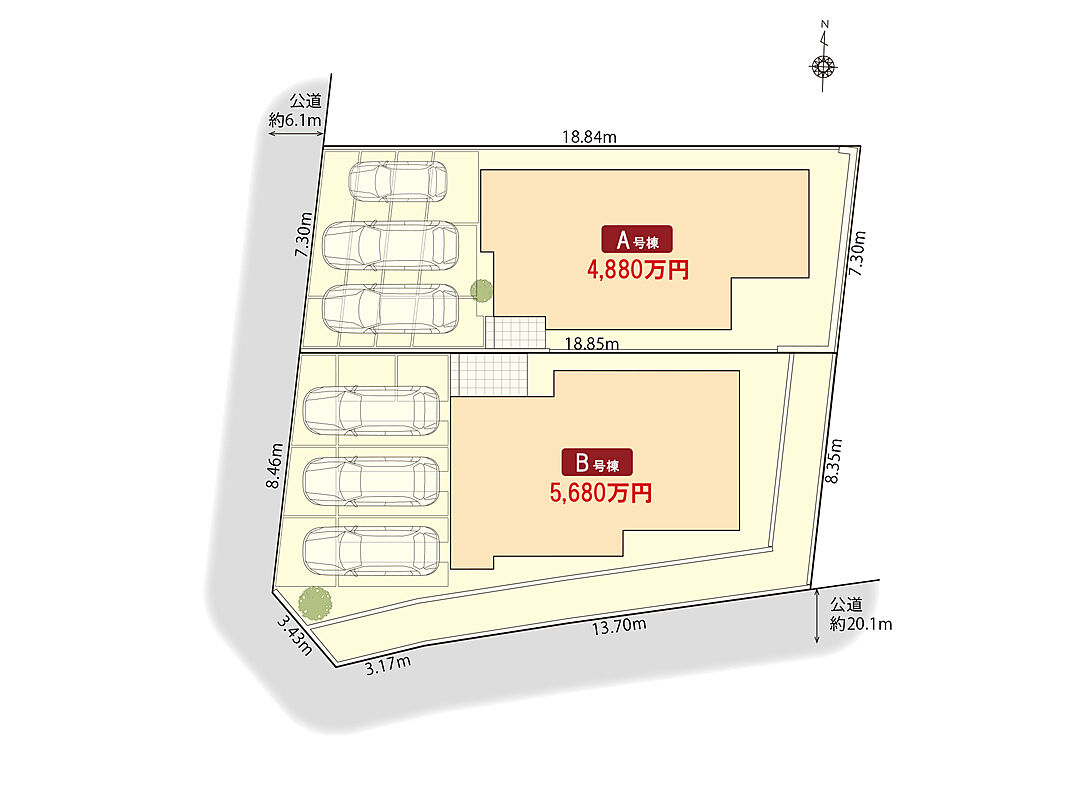 | 駐車場 | 3台(A号棟のみ車種による) | 道路の幅員 | 西側6.1m、南側20.1m |