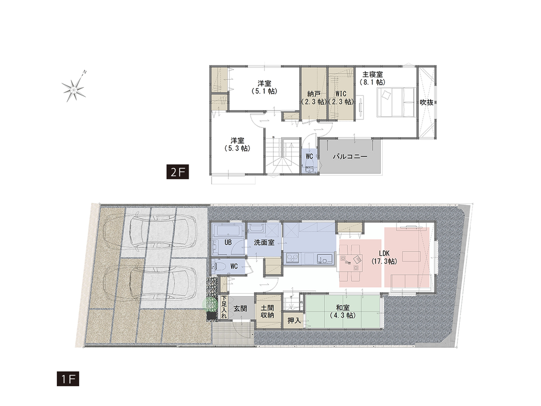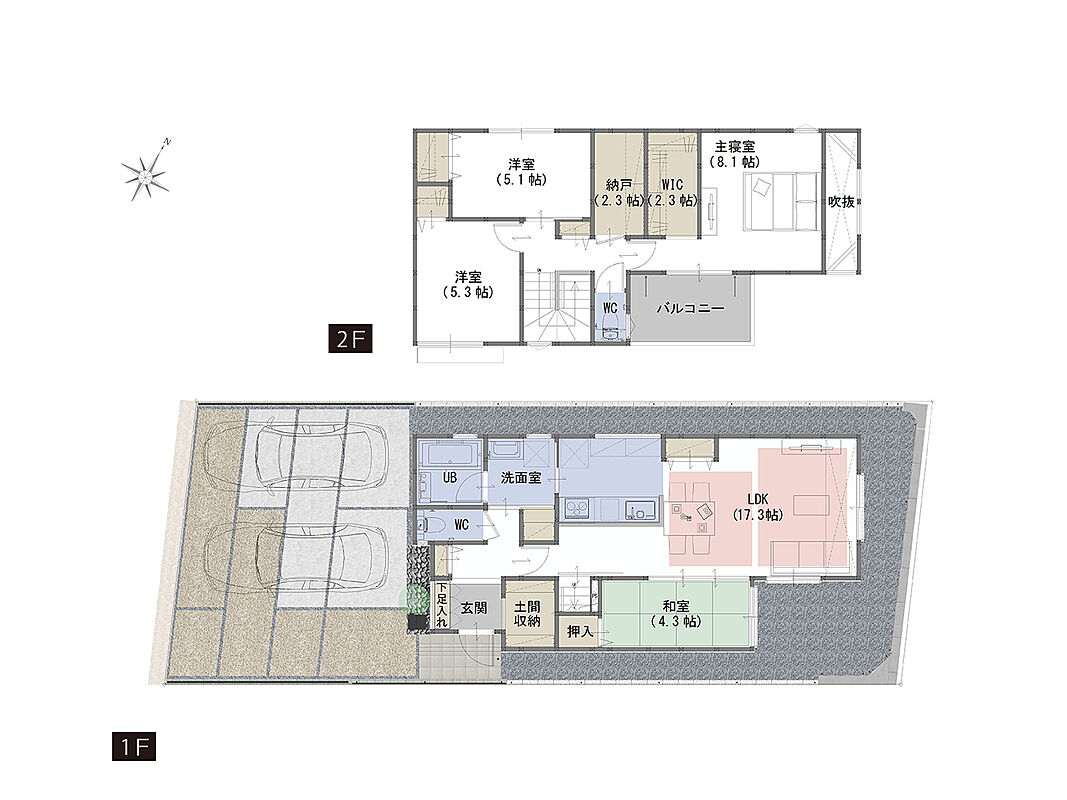 | 建物面積 | 102.90m2(A号棟)~104.56m2(B号棟) | 土地面積 | 136.85m2(A号棟)~179.93m2(B号棟) |