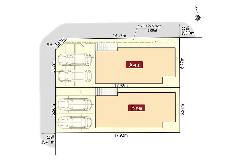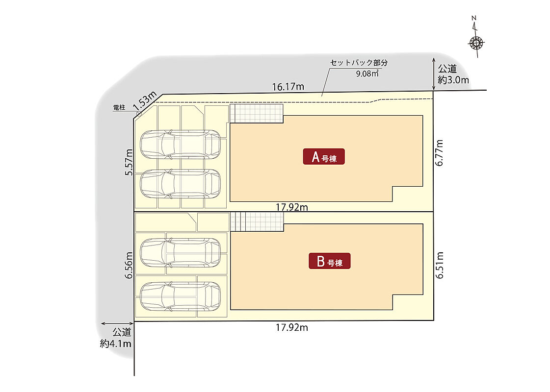 | 建物面積 | 107.48m2(A号棟)・108.08m2(B号棟) | 土地面積 | 117.23m2(B号棟)・126.51m2(A号棟 セットバック部分9.08m2含む) |
