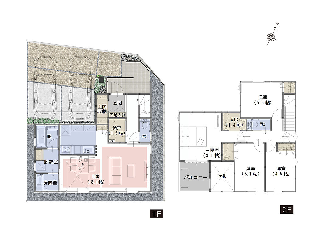 | 駐車場 | 2台 | 道路の幅員 | 北西側6.4m、北東側8.0m、南東側4.0m |