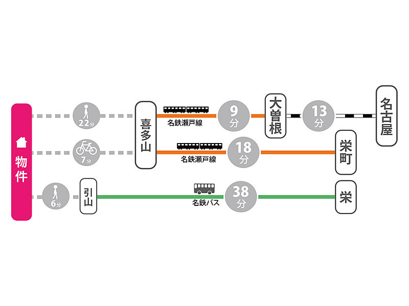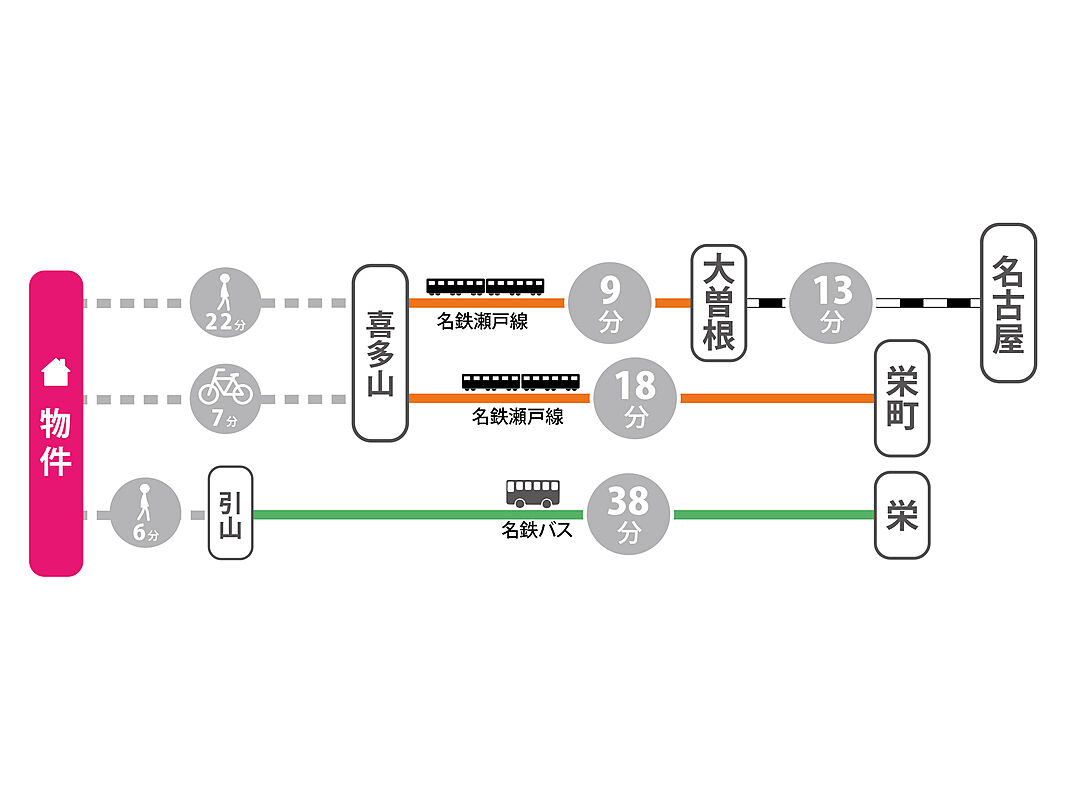 名鉄瀬戸線「喜多山」駅 徒歩22分 名古屋市営東山線「栄」駅 名鉄バス38分「引山」停 徒歩6分 名鉄瀬戸線「大森・金城学院前」駅 徒歩24分 |