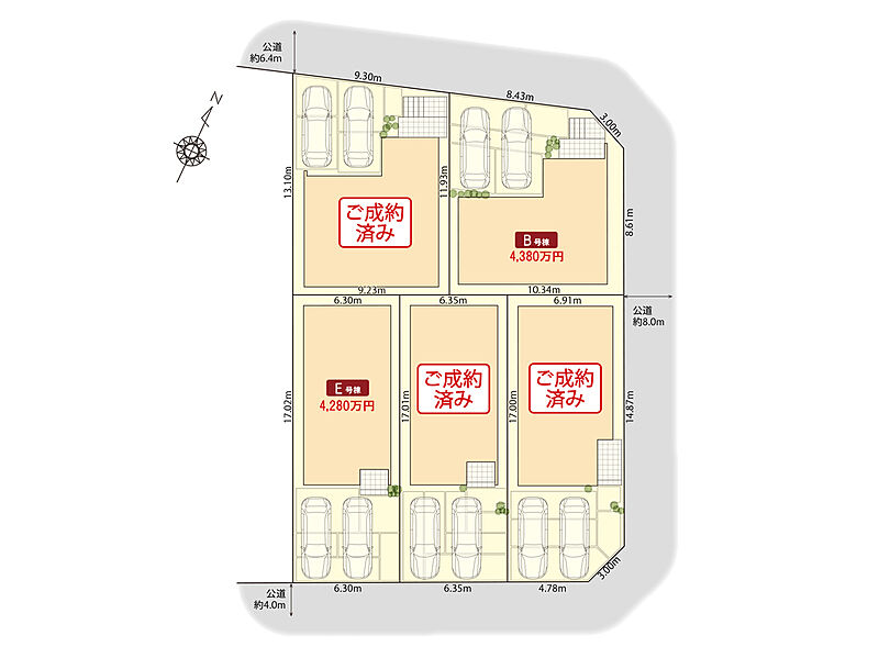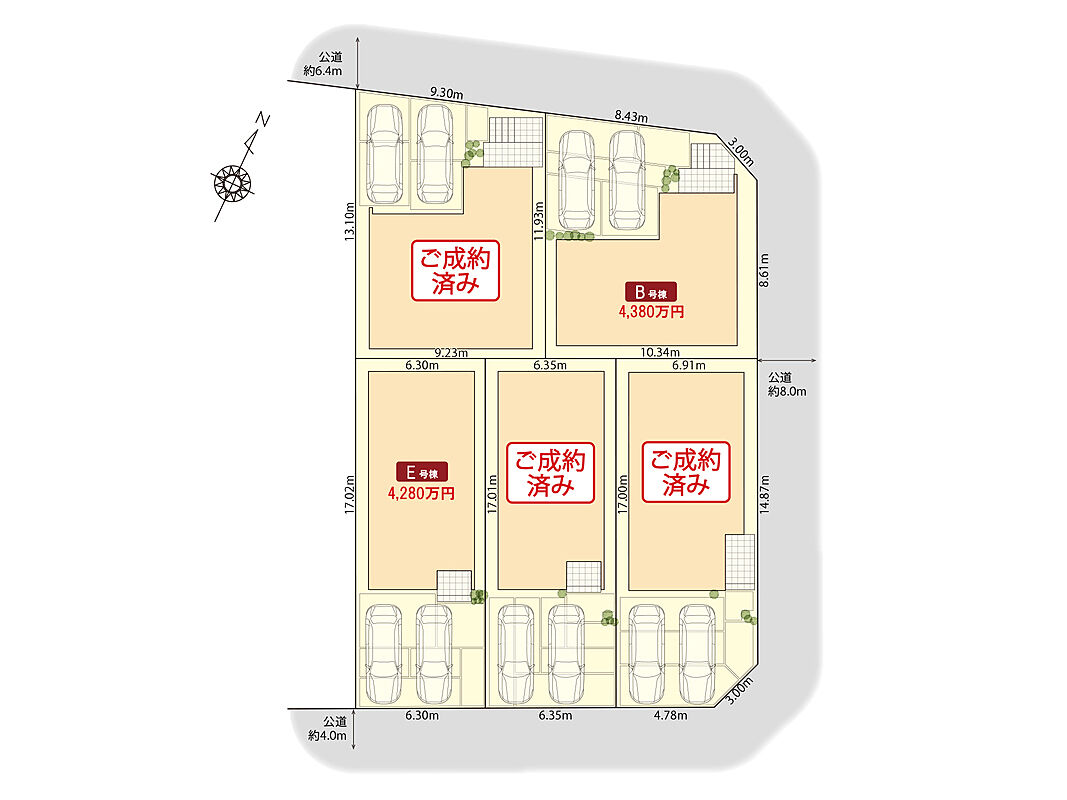 | 建物面積 | 103.73m2(B号棟)~104.03m2(E号棟) | 土地面積 | 107.30m2(E号棟)~114.65m2(B号棟) |