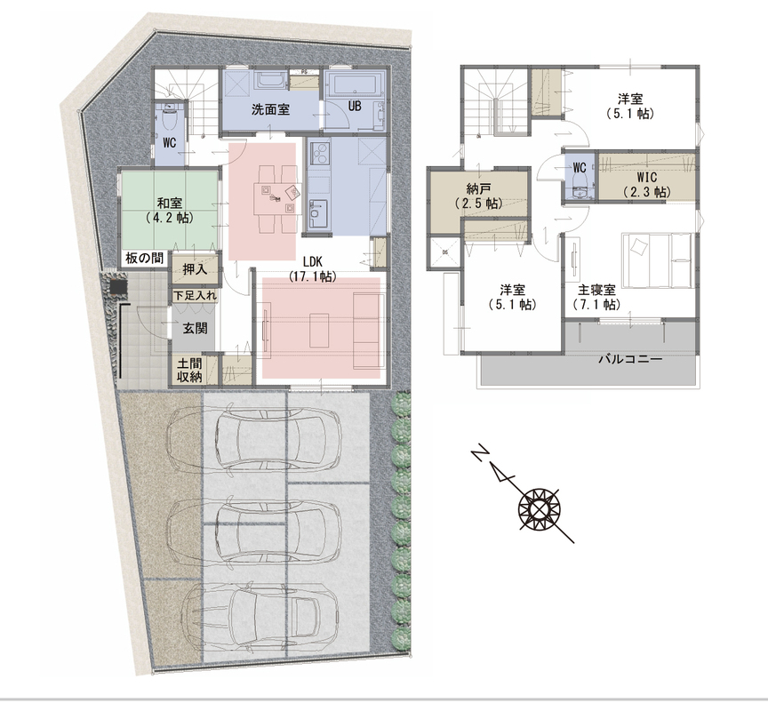 | 駐車場 | 3台 | 道路の幅員 | 北東側10.3m、北西側11.3m |