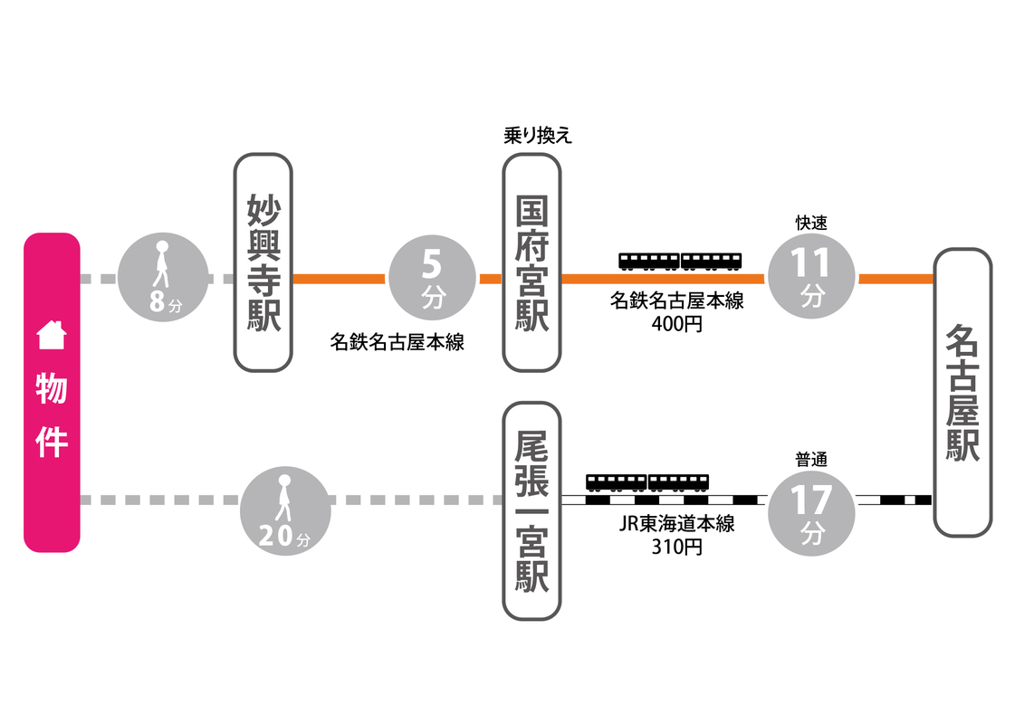 名鉄名古屋本線「妙興寺」駅 徒歩8分 JR東海道本線「尾張一宮」駅 徒歩20分 名鉄名古屋本線「名鉄一宮」駅 徒歩22分 |