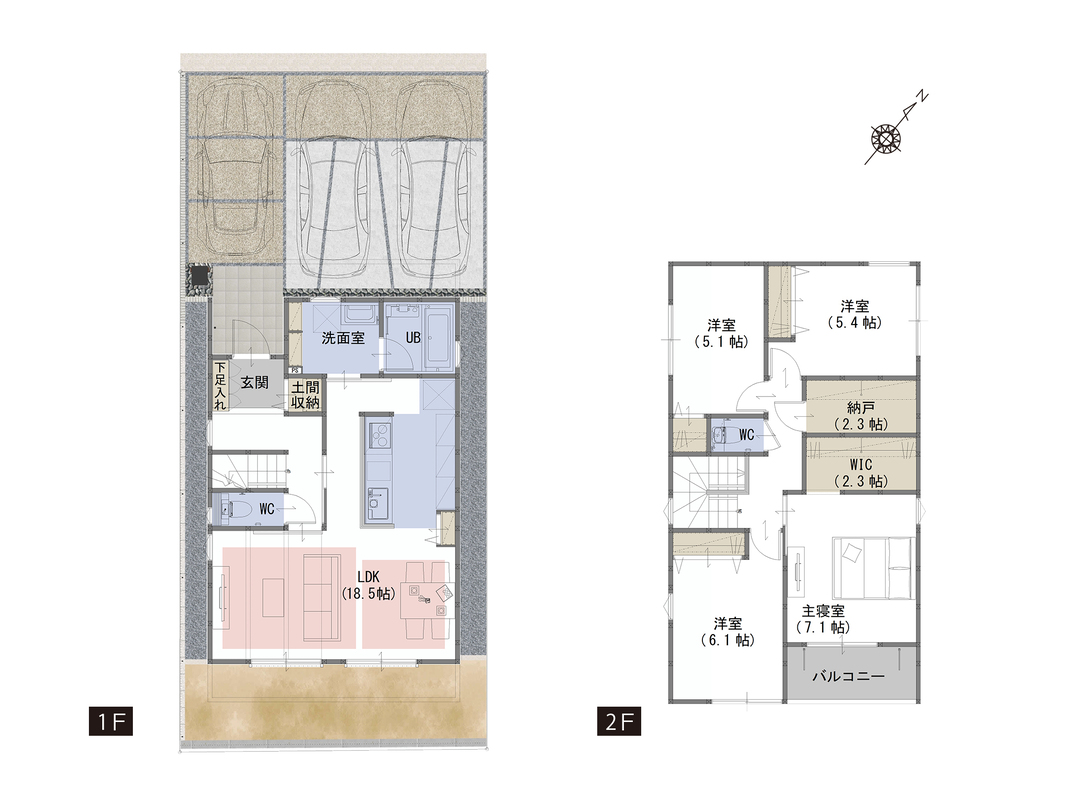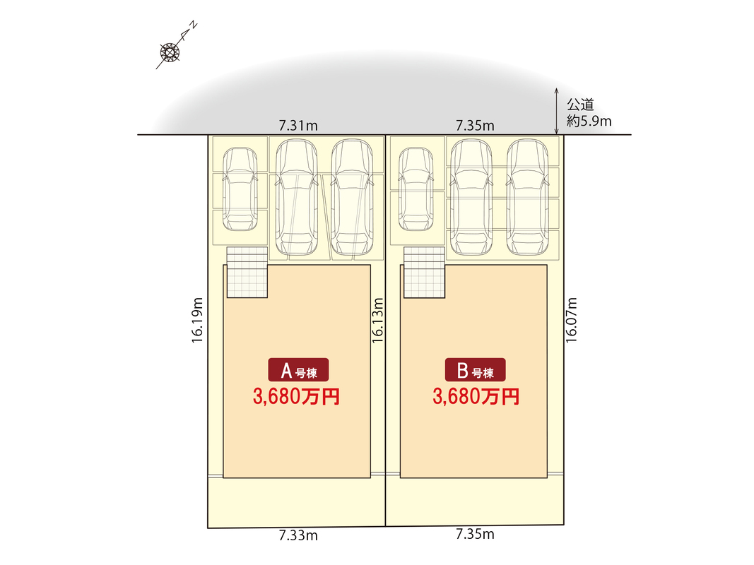 | 建物面積 | 106.22m2 | 土地面積 | 118.38m2(A号棟)~118.50m2(B号棟) |