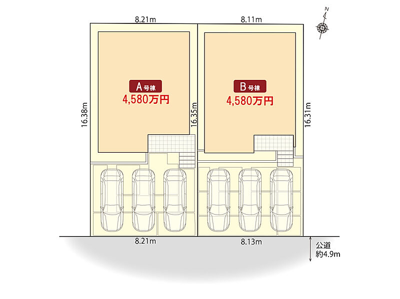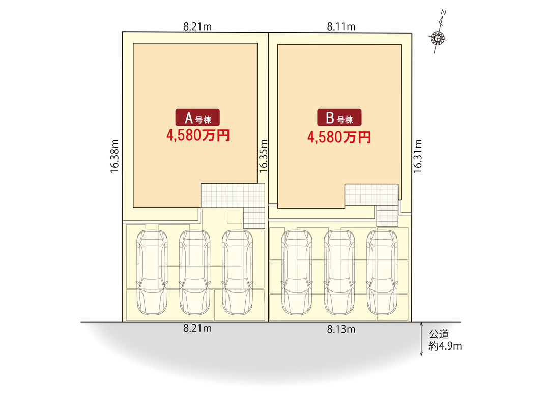 | 建物面積 | 103.93m2(A号棟)~104.14m2(B号棟) | 土地面積 | 132.74m2(B号棟)~134.49m2(A号棟) |