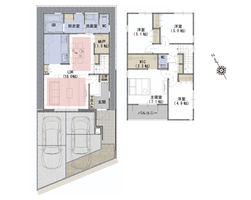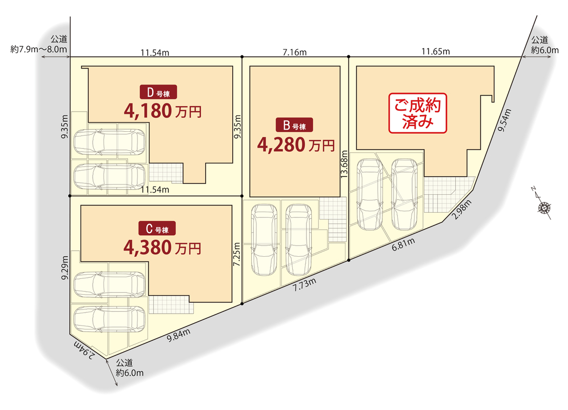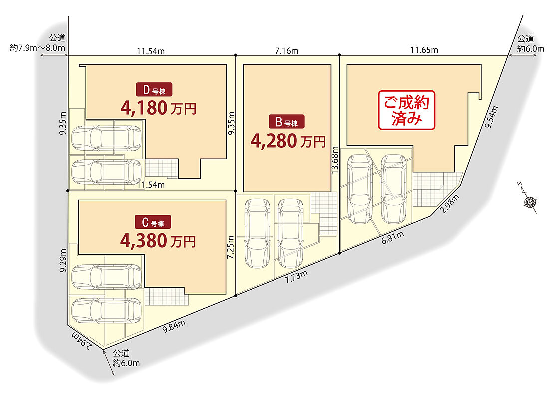| 駐車場 | 2台 | 道路の幅員 | 南側6.0m、北西側7.9m~8.0m |