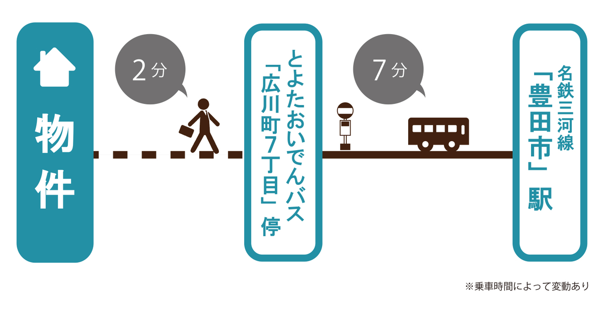名鉄三河線「豊田市」駅 徒歩29分 愛知環状鉄道「新豊田」駅 徒歩32分 名鉄豊田線「梅坪」駅 徒歩38分 |