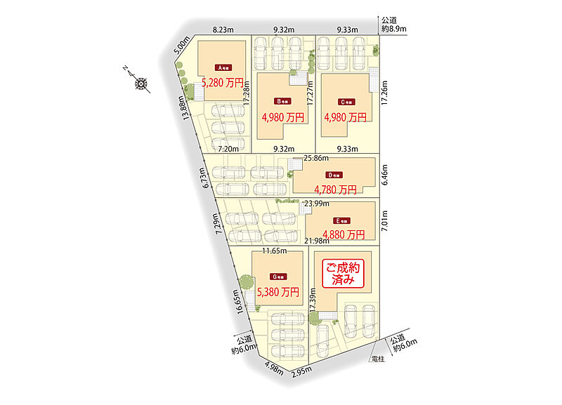 | 駐車場 | 3台 ~ 4台(A・B・C・G棟(3台)・D・E棟(4台)) | 道路の幅員 | 北東側公道幅員約8.9m、西側公道幅員約6.0m、南側公道幅員約6.0m |