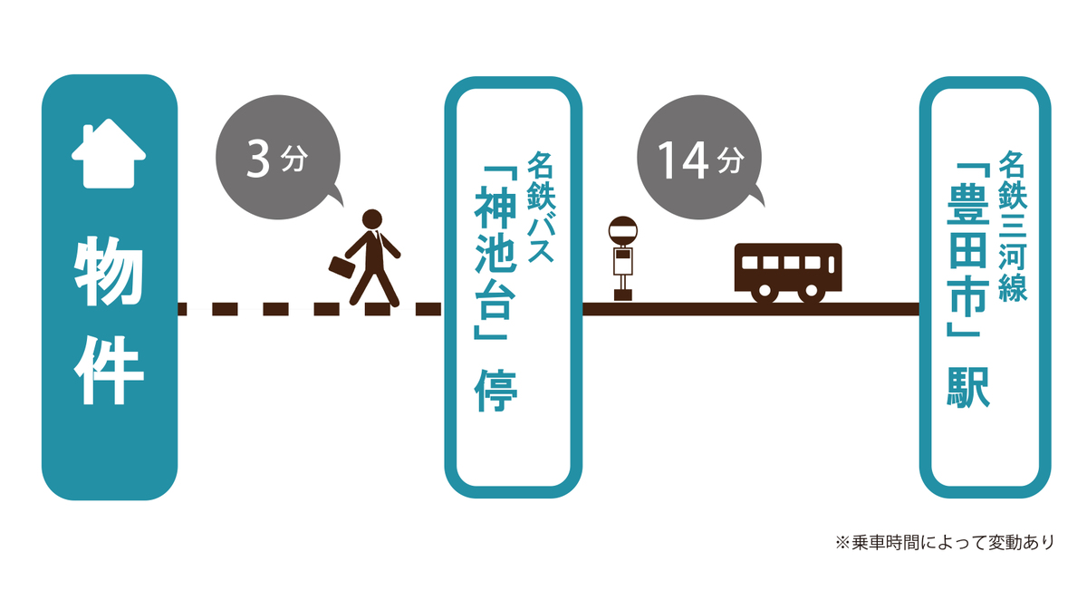 名鉄三河線「豊田市」駅 徒歩43分 愛知環状鉄道「新豊田」駅 徒歩45分 名鉄三河線「越戸」駅 徒歩50分 |