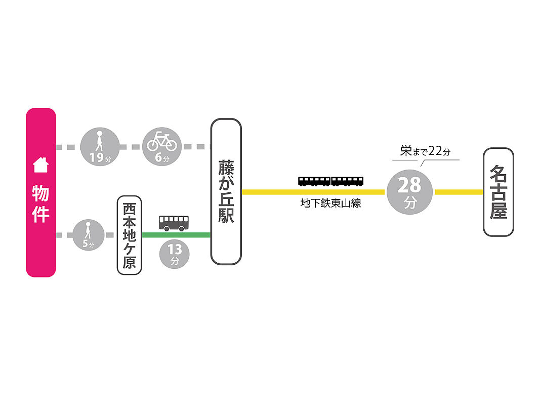 名古屋市営東山線「藤が丘」駅 徒歩19分 愛知高速東部丘陵線「はなみずき通」駅 徒歩30分 名古屋市営東山線「本郷」駅 徒歩34分 |
