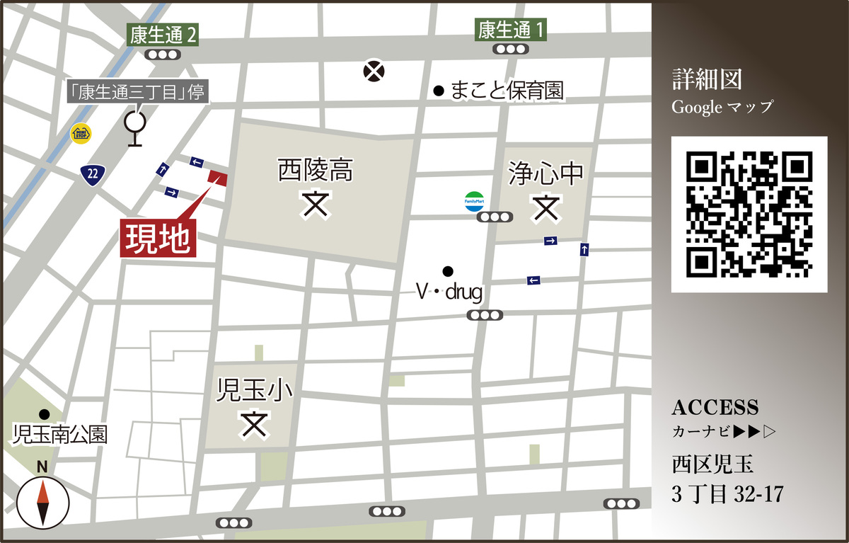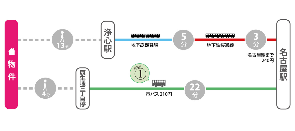 名古屋市営鶴舞線「浄心」駅 徒歩13分 市バス「康生通三丁目」停 徒歩4分 「名古屋」駅まで乗車22分! 名古屋市営鶴舞線「庄内通」駅 徒歩19分 |