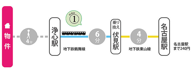 名古屋市営鶴舞線「浄心」駅 徒歩4分 名古屋市営鶴舞線「庄内通」駅 徒歩15分 名古屋市営名城線「名城公園」駅 徒歩21分 |