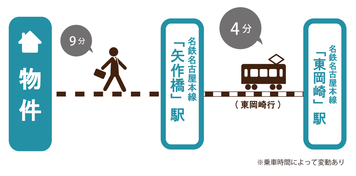 名鉄名古屋本線「矢作橋」駅 徒歩9分 名鉄名古屋本線「宇頭」駅 徒歩24分 愛知環状鉄道「中岡崎」駅 徒歩29分 |