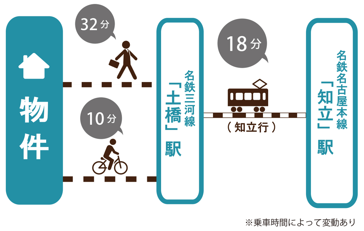 名鉄三河線「土橋」駅 徒歩32分 愛知環状鉄道「新豊田」駅 徒歩52分 名鉄三河線「上挙母」駅 徒歩57分 |