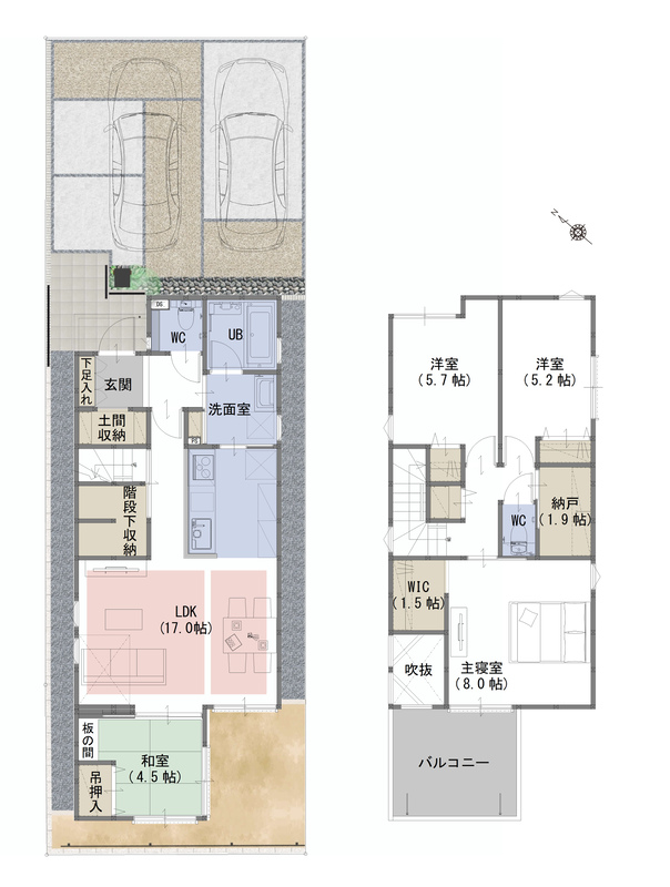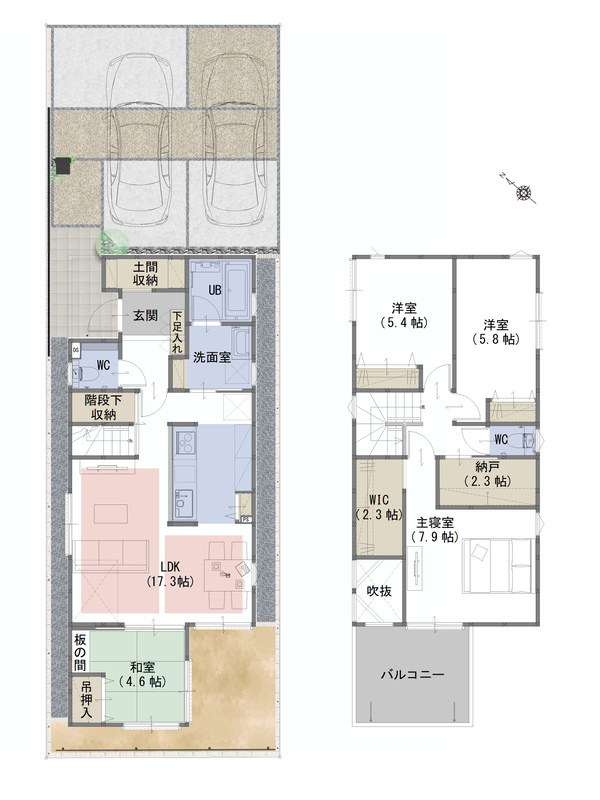 | 建物面積 | 102.06m2~103.94m2 | 土地面積 | 127.53m2・127.54m2 |