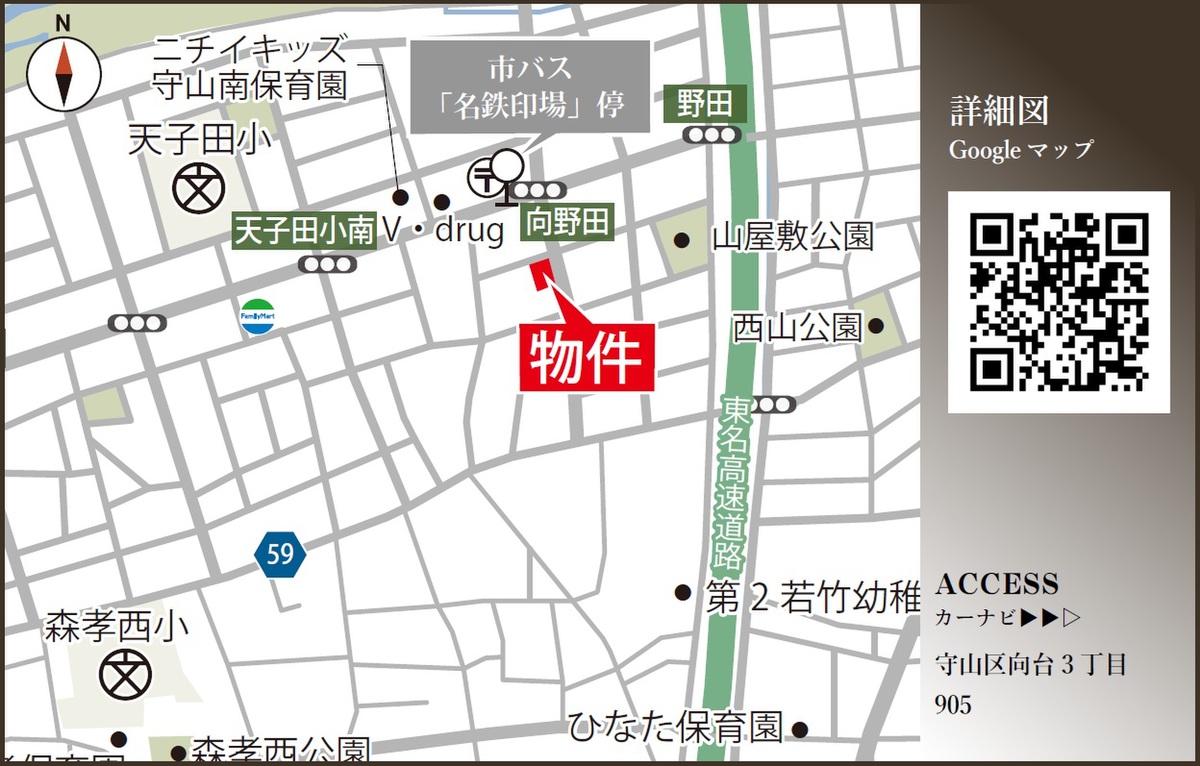 名鉄瀬戸線「印場」駅 名古屋市バス「天子田」停 徒歩2分 名鉄瀬戸線「大森・金城学院前」駅 徒歩27分 名鉄瀬戸線「旭前」駅 徒歩33分 |