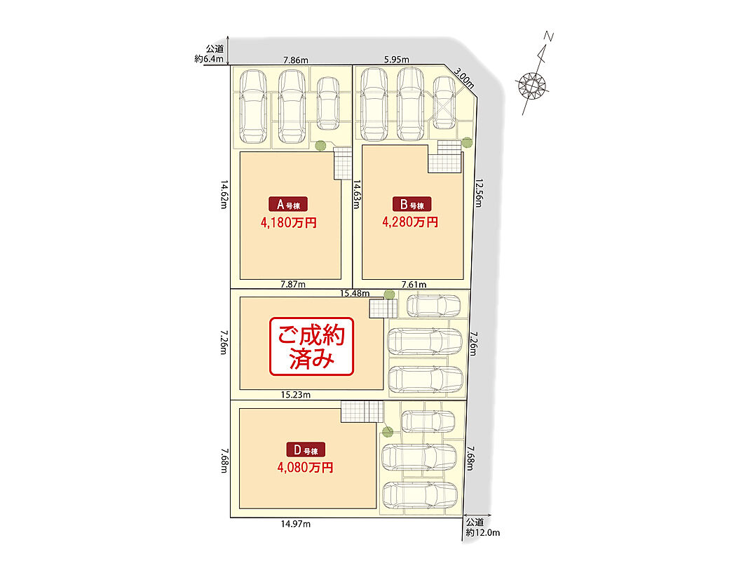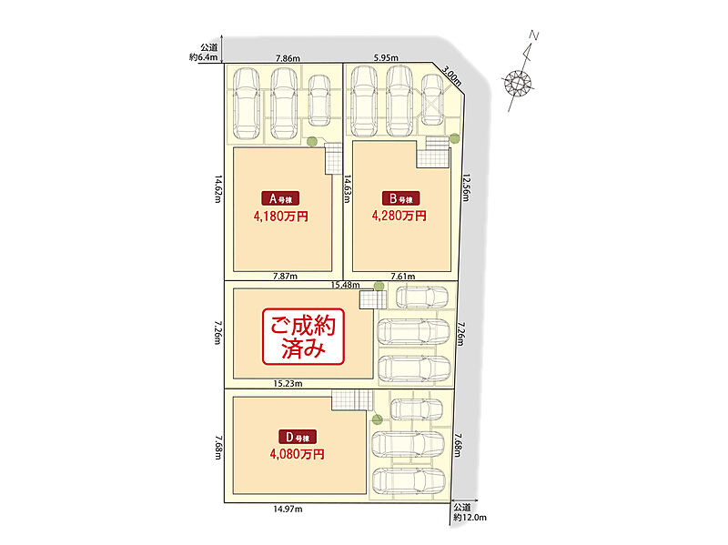 | 駐車場 | 3台(車種による) | 道路の幅員 | 北側6.4m、東側12.0m |