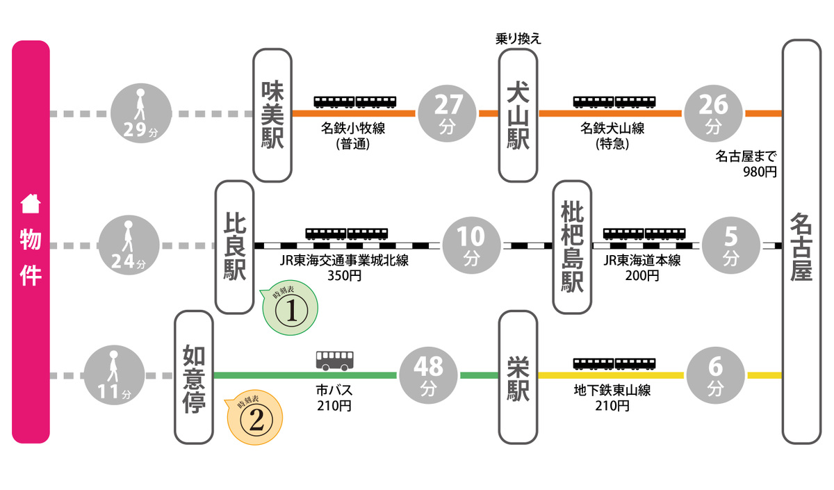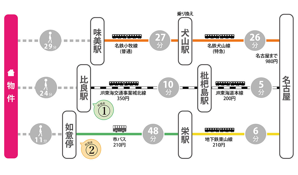 名鉄小牧線「味美」駅 徒歩29分 JR東海交通城北線「味美」駅 徒歩24分 市バス「如意」停 徒歩11分 |