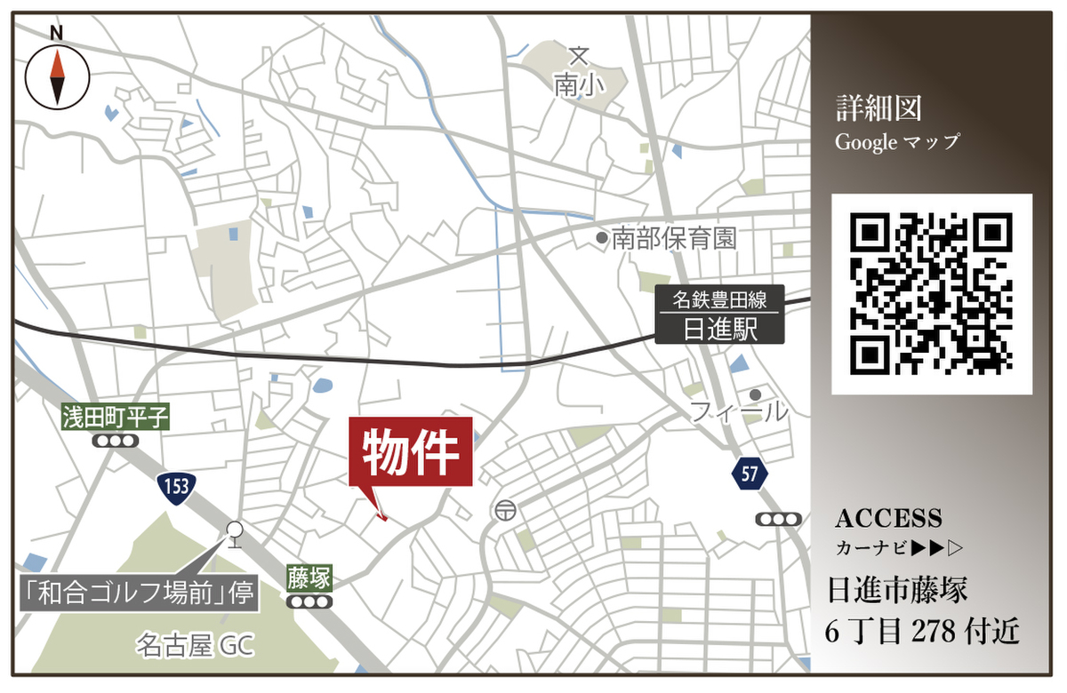 名鉄豊田線「日進」駅 徒歩17分 名古屋市営鶴舞線「赤池」駅 名鉄バス「和合ゴルフ場前」停 徒歩8分 乗車9分 名古屋市営鶴舞線「赤池」駅 徒歩30分 |