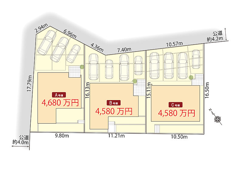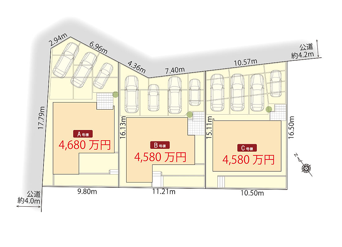 | 駐車場 | 3台 ~ 4台(A棟(3台)・B・C棟(4台)) | 道路の幅員 | 北側公道幅員4.2m、西側公道幅員4.0m |