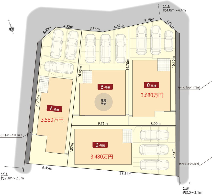 | 駐車場 | 3台 | 道路の幅員 | 北側4m(セットバック含む) 東側4m(セットバック含む) 西側4m(セットバック含む) |