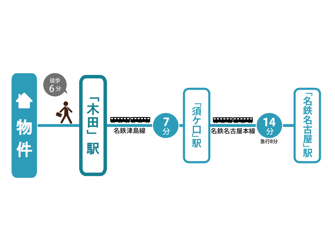 名鉄津島線「木田」駅 徒歩6分 名鉄津島線「青塚」駅 徒歩25分 名鉄津島線「七宝」駅 徒歩30分 |