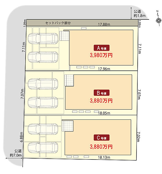 | 駐車場 | 2台 | 道路の幅員 | 北側4m(セットバック含む) 、西側7m |