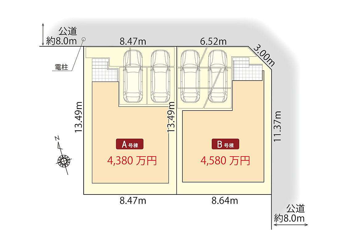 | 駐車場 | 2台 | 道路の幅員 | 北側公道幅員約8.0m、東側公道幅員約8.0m |