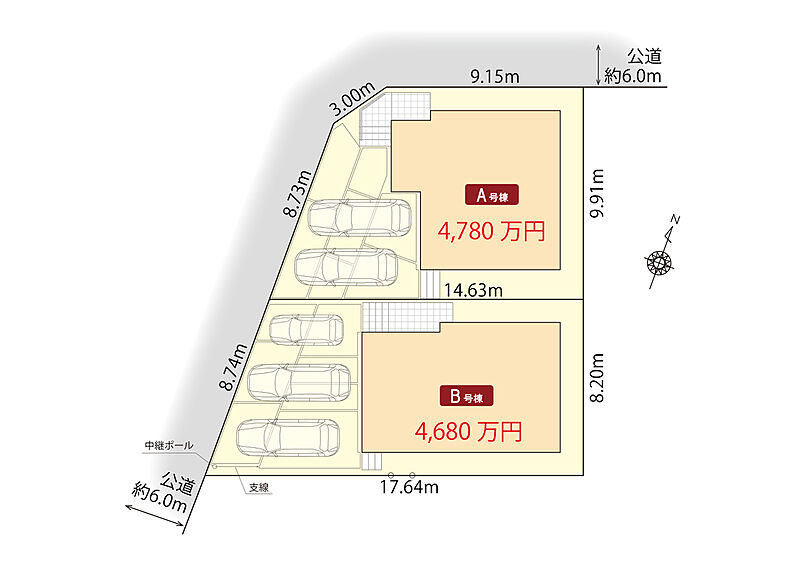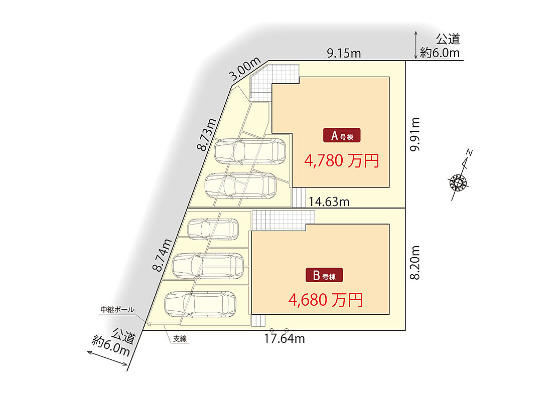 | 駐車場 | 2台 ~ 3台(A棟(2台)・B棟(3台)) | 道路の幅員 | 北西側公道幅員約6.0m、南西側公道幅員約6.0m |